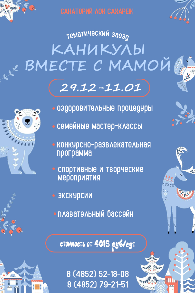 Санаторий Лечебно-оздоровительного комплекса «Сахареж» предлагают замечательную программу «Каникулы вместе с мамой», которая позволит вам и вашему ребенку провести зимние каникулы с пользой для здоровья. Это отличная возможность укрепить иммунитет через активные прогулки на свежем воздухе и разнообразные оздоровительные процедуры.